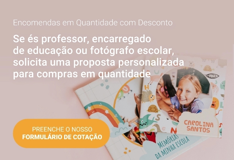 Se estás a preparar uma despedida de turma, és fotógrafo escolar ou estás a organizar a festa de finalistas, fica a saber que temos condições especiais para encomendas em quantidade. Na Dreambooks podes criar lembranças para finalistas de curso ou lembranças para finalistas do 1o ciclo. Podes fazer o pedido através do nosso formulário de cotação para grupos — ideal para escolas, professores e outras pessoas que organizam este tipo de evento.